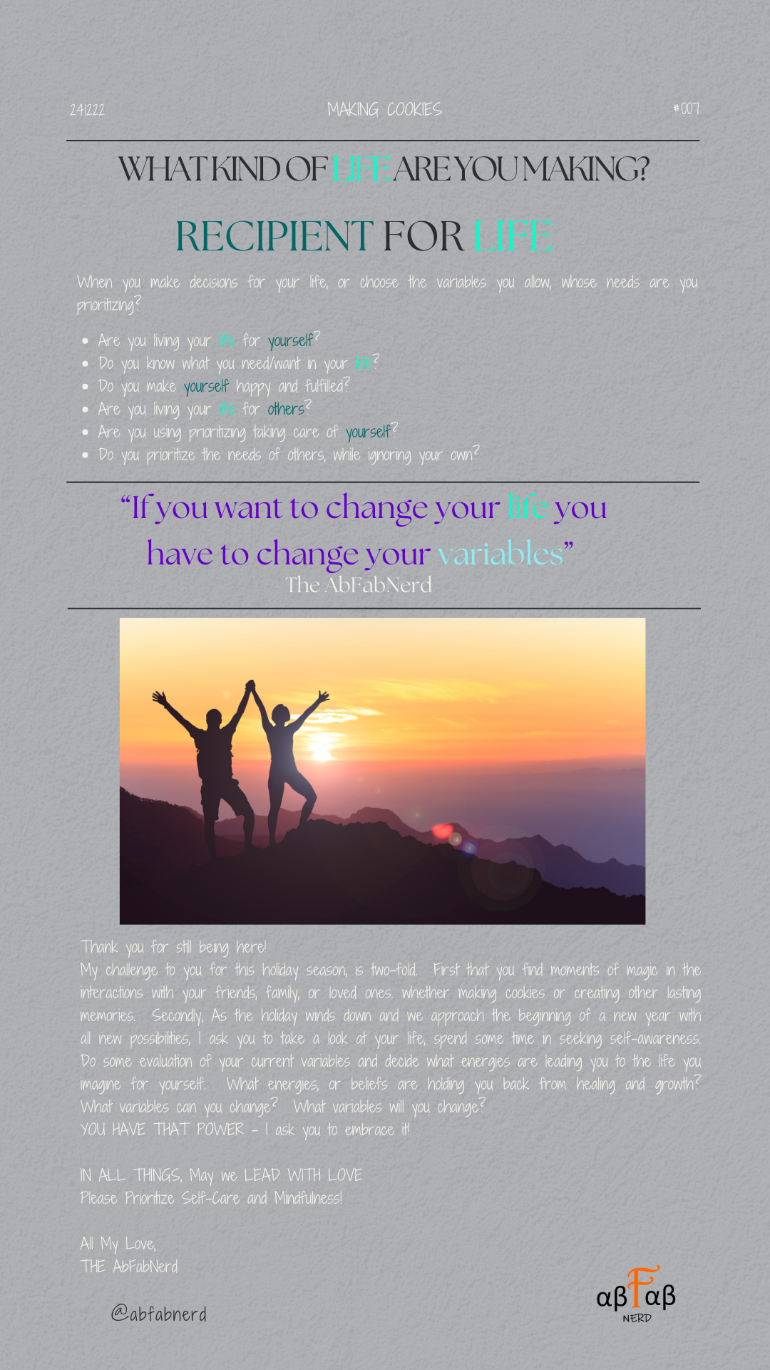 WHAT KIND OF COOKIES ARE YOU MAKING? Dec 23 Written By Renae Hines recipe for lifevariables for lifetools for lifeabfabnerdabsolutely fabulous nerdmental health mindfulnessabsolutely fabulous nerd brain analysisemotional healingpersonal growthmindfulnessselfcarenourish your mindempower yourselfmindful mindsetlove your lifeembrace changegrowth mindsetself reflectionhealthy habitsmental wellness nerdintentional livingself awareness tipswellness wisdommindful selfcarepositive mindsetlead with lovemindful livinghealing journeylife lessonstransformative thinkingabfabnerd blogsnerdy wellnessselfcare strategiespersonal growth journeymindfulness mattersmental health awareness Renae Hines https://www.abfabnerd.com